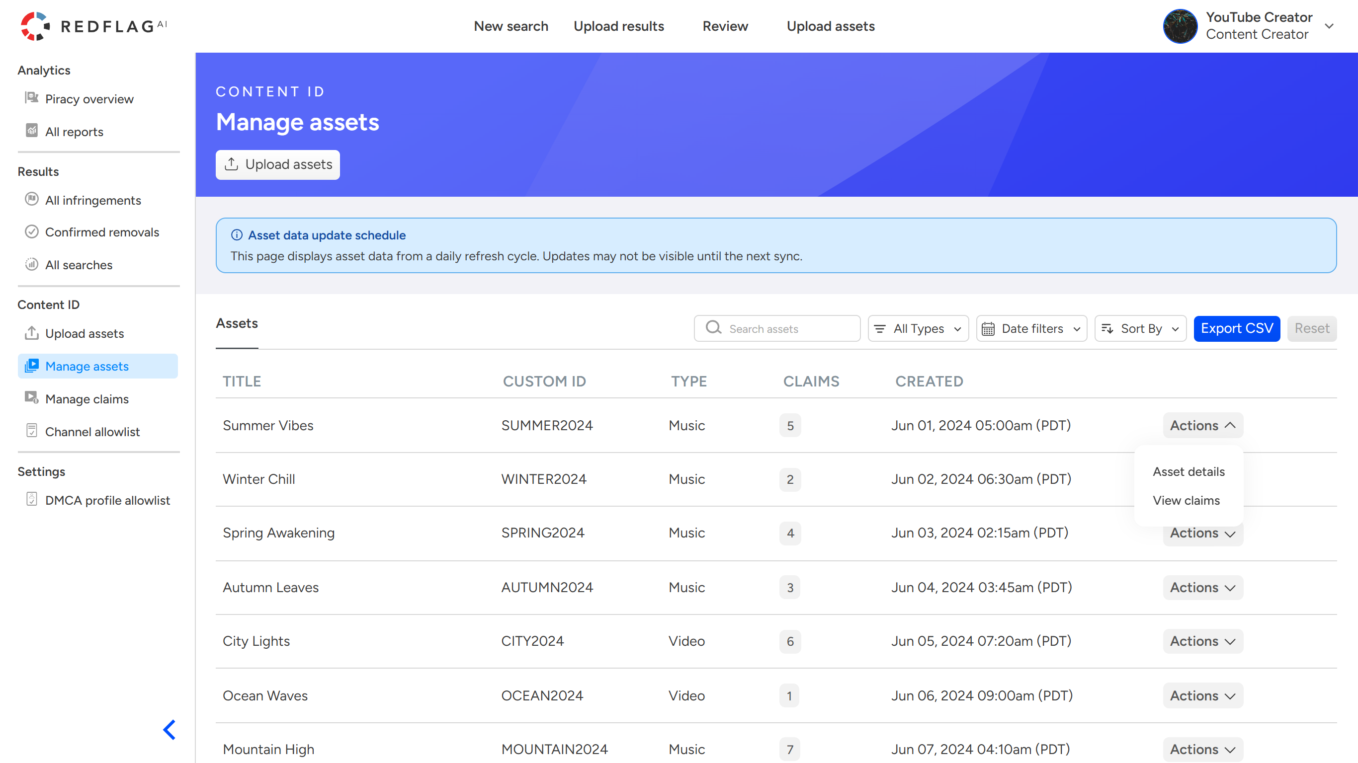 Take control of your intellectual property with Redflag AI’s direct integration into the YouTube Content ID Studio.